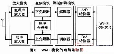 Wi—Fi模塊的功能連接圖如圖6所示。本系統(tǒng)的天線是外置天線,這樣能盡量穩(wěn)定信號(hào)。天線與RF射頻模塊相連,RF射頻模塊大致可分為放大模塊、變頻模塊、調(diào)制解調(diào)模塊等有源部件,然后通過A/D、D/A轉(zhuǎn)換與Wi—Fi控制芯片相連。Wi—Fi控制芯片控制整個(gè)無(wú)線模塊的運(yùn)行。