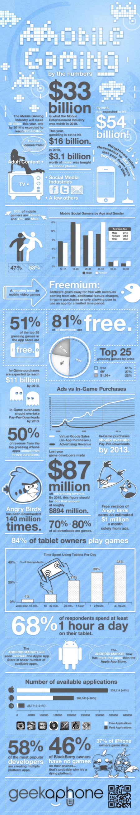 隨著移動互聯(lián)網(wǎng)浪潮的興起,大家玩游戲的平臺逐漸從傳統(tǒng)的游戲機,PC,TV向新興的智能手機和平板電腦等移動終端遷移。PC時代的游戲巨頭EA,育碧等公司的光芒不再,PopCap,Rovio和Zynga等新興游戲公司出品的游戲則吸引著越來越多的玩家。照目前強勁的發(fā)展趨勢來看,移動游戲在未來將取得像PC游戲現(xiàn)在的地位,成為游戲市場的主力。關(guān)注移動終端發(fā)展的博客Geekaphone制作了下面這張超大信息圖,用詳細的統(tǒng)計數(shù)字展示了移動游戲發(fā)展的強勁趨勢。