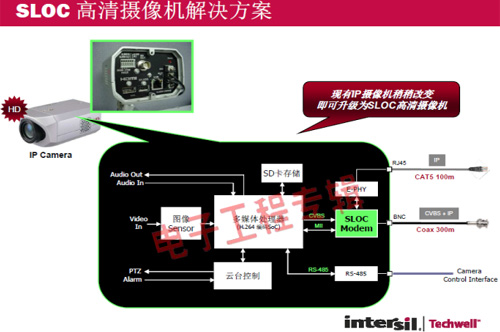 革命性的Intersil Techwell SLOCTM(Security Link over Coax)同軸電纜復合視頻傳輸解決方案是可通過一條同軸電纜同時傳輸模擬 CVBS 視頻和高清數(shù)字 IP 視頻信號的先進調(diào)制解調(diào)器解決方案,其采用最新MODEM PHY技術的傳輸解決方案,可以基于同軸電纜同時傳輸高清IP碼流和標清模擬實時視頻。