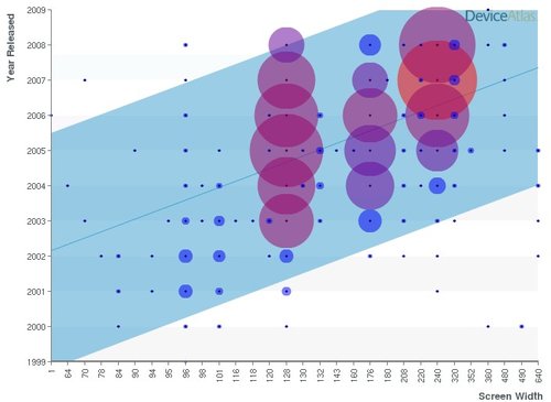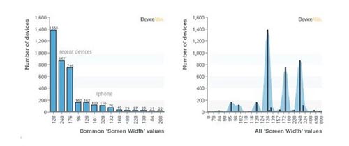 還有一點(diǎn),不到5%的設(shè)備寬度大于320個(gè)像素。但這一數(shù)字可能會(huì)在未來(lái)有所提升,目前已經(jīng)可以看到,小屏幕(128,176等)設(shè)備正逐漸被大屏幕(240+)設(shè)備所代替。下面的圖表給出了相關(guān)的分析。