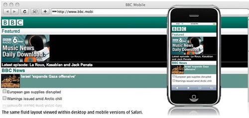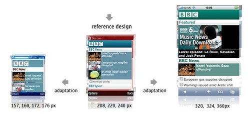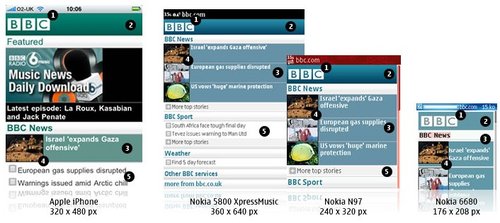 BBC還可以為特定的設(shè)備(或是一組設(shè)備)重新編排一些內(nèi)容。iPhone有非常豐富的功能,因此iPhone版的BBC還有音樂(lè)下載選項(xiàng),而其他的設(shè)備可能只會(huì)顯示今天最熱門(mén)的‘BBC新聞’?梢愿鶕(jù)數(shù)據(jù)的大小,多媒體的處理能力甚至是屏幕的尺寸決定是否需要針對(duì)iPhone提供更加豐富的內(nèi)容。以Nokia 6680上的‘特色’顯示為例,它大部分的顯示內(nèi)容是讓用戶(hù)滾動(dòng)屏幕查看今天最熱門(mén)新聞故事。iPhone上顯示了三個(gè)新聞故事,而其中只有一篇配有插入。這使得用戶(hù)無(wú)需滾動(dòng)屏幕就可以大致了解全部的咨詢(xún)。