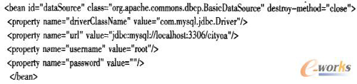 與本地開發(fā)不同的是云計算平臺下,由于服務(wù)器采用虛擬主機(jī)技術(shù),無法像本地服務(wù)器那樣配置數(shù)據(jù)庫連接池,因此需要CRM系統(tǒng)自己管理數(shù)據(jù)庫連接池。本系統(tǒng)使用Spring管理下的數(shù)據(jù)庫連接池,運(yùn)用Apache開源DBCP框架配置連接池代碼如下: