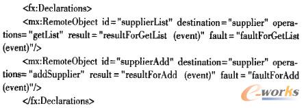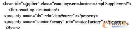 客戶層采用Flex4的Spark UI組件和ActionScript分別實(shí)現(xiàn)MVC模式的View和Control層,實(shí)現(xiàn)與系統(tǒng)用戶的交互,并通過Spring BalazeDs集成框架發(fā)布的Remote Object,實(shí)現(xiàn)與業(yè)務(wù)層對象的通訊,進(jìn)而完成CRM業(yè)務(wù)處理。如下代碼為Flex中聲明Remote Object: