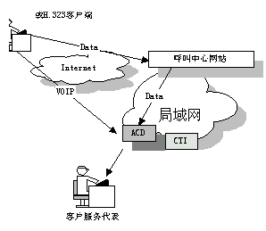 國際上一些先進的 呼叫中心產(chǎn)品供應商現(xiàn)在已經(jīng)把 Web 技術引入到他們的產(chǎn)品中了。通過屏幕上的一個按鈕可以利用 Internet 電話把客戶和呼叫中心連接起來?蛻羰褂靡粋很普通的帶有麥克風﹑聲卡以及傳輸速率不小于 28.8 kbps 的Modem 的多媒體 PC 機,并配有 Web 瀏覽器以及與 H.323兼容的應用軟件就可以利用把他們連接到 Web 站點的那條電話線與呼叫中心的座席員交談。其簡單示意圖如下: