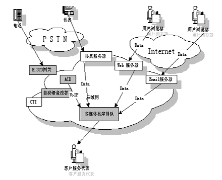 多媒體呼叫中心實際上是基于CTI 技術的傳統(tǒng)呼叫中心與 ICC 的相互結合,F(xiàn)在許多呼叫中心把各種媒體通信技術集成到了一起,允許座席員同時可以處理語音呼叫﹑Web請求﹑e-mail和傳真。其簡單示意圖如下: