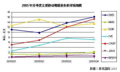 2005年分季度主要移動(dòng)增值業(yè)務(wù)的市場規(guī)模圖
