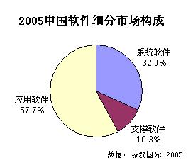 新華美通消息:易觀國際 發(fā)布的《IT 產品和服務-中國軟件市場年度綜合報告2005-2006》中數(shù)據(jù)顯示,2005年,中國軟件市場全年銷售額為324.4億元人民幣。同比增長22.2%。其中,系統(tǒng)軟件市場穩(wěn)定增長,市場規(guī)模達到103.8億元。支撐軟件市場增速提高,同比增長25.2%。應用軟件市場規(guī)模達187.3億人民幣,相比2004年的151.2億增長了23.9%。其中市場對應用軟件的需求量最大,占整個市場的57.7%。對系統(tǒng)軟件的需求居第二,占到32.0%,而支撐軟件則需求相對較小,占到10.3%的份額。