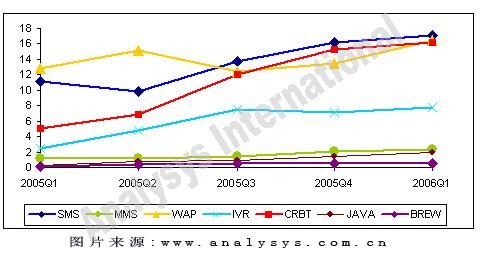 短信業(yè)務(wù)的市場(chǎng)規(guī)模為17.08億,比上個(gè)季度小幅增長(zhǎng)5.4%。雖然 WAP 業(yè)務(wù)和 CRBT 業(yè)務(wù)的市場(chǎng)規(guī)模和短信業(yè)務(wù)非常接近,但是短信業(yè)務(wù)仍然是移動(dòng)增值業(yè)務(wù)中比重最大的一塊。更為重要的是,短信業(yè)務(wù)仍然是