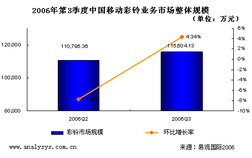 研究表明,2006年第3季度,CRBT業(yè)務略有反彈。其中移動彩鈴業(yè)務的分帳前信息費接近16000萬元,較上個季度小幅度反彈2.6%。但是總體上仍然呈現(xiàn)徘徊態(tài)勢,并沒有走出低級飽和區(qū)。