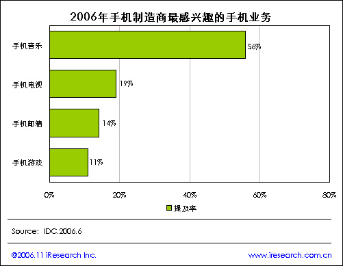 iResearch艾瑞市場咨詢根據(jù)IDC統(tǒng)計數(shù)據(jù)顯示,2006年手機制造商最感興趣的手機業(yè)務(wù)情況,手機音樂是手機制造商最感興趣的業(yè)務(wù),提及率達到56%,然后依次是手機電視19%、手機郵箱14%以及手機游戲11%.