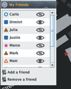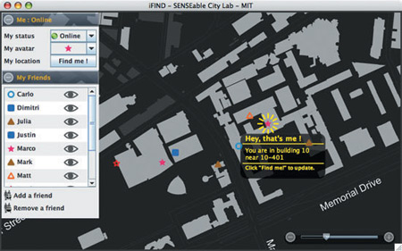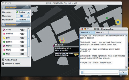 該軟件名為iFind,乍一看類(lèi)似任何典型的即時(shí)通信軟件,也需要雙方相互邀請(qǐng),這樣才能進(jìn)入對(duì)方的好友名單。用戶可以選擇暫時(shí)隱藏起來(lái),不讓某個(gè)好友或者整個(gè)群組看見(jiàn)自己,他們還可以完全把某人從好友名單中刪除。不過(guò)iFind的好友名單增加了地圖,可以實(shí)時(shí)顯示這些朋友在MIT校園的哪個(gè)角落。地圖顯示了通過(guò)Wi-Fi登錄到MIT網(wǎng)絡(luò)上的好友,讓用戶可以為每個(gè)朋友創(chuàng)建獨(dú)特的迷你頭像,能看到誰(shuí)在學(xué)校河邊閑逛、誰(shuí)在樓上圖書(shū)館看書(shū)。