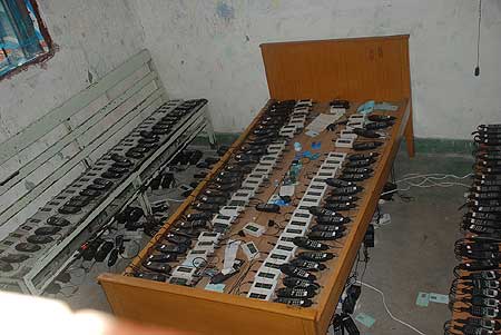 22日,辦案民警喬裝普通市民在民房里搜尋,透過窗戶終于發(fā)現(xiàn)一間房間里平整地?cái)[放著一兩百部手機(jī)。不一會兒,他們等來了房東雷某,將房門打開,眼前的一幕讓民警們大吃一驚,只見房間里的木床和椅子上一排排整齊地?cái)[放著近兩百部手機(jī),每部手機(jī)連接一個白色的盒子,指示燈在不停地閃爍著。
