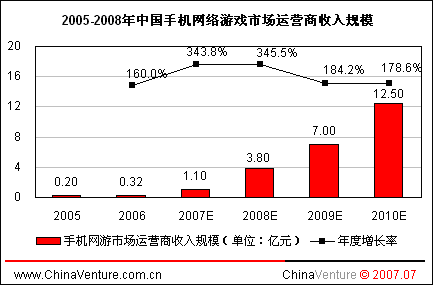 創(chuàng)業(yè)投資研究機構ChinaVenture近日發(fā)布了《ChinaVenture 2007年中國手機網(wǎng)游行業(yè)投資價值研究報告》,該報告顯示,2007年隨著手機網(wǎng)游用戶數(shù)量和產(chǎn)品大規(guī)模增加,手機網(wǎng)游市場運營收入將達1.10億人民幣。2008年仍將呈現(xiàn)高速增長,達3.80億元人民幣。(見圖一)