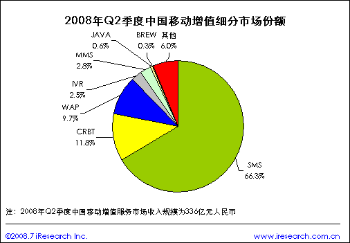 推薦本文根據(jù)艾瑞咨詢最新發(fā)布的《2008年第二季度中國(guó) 移動(dòng)增值市場(chǎng)監(jiān)測(cè)報(bào)告》的相關(guān)數(shù)據(jù)顯示,08年第二季度中國(guó)移動(dòng)增值服務(wù)市場(chǎng)的收入規(guī)模為336億元人民幣,其中傳統(tǒng)增值業(yè)務(wù)占據(jù)大部分市場(chǎng)份額,尤其是短信業(yè)務(wù),在增值服務(wù)市場(chǎng)上的份額達(dá)到了66.3%.預(yù)計(jì)隨著電信業(yè)重組的逐步完成及3G新業(yè)務(wù)的推出將對(duì)增值服務(wù)市場(chǎng)的發(fā)展起到積極的推動(dòng)作用,傳統(tǒng)短信業(yè)務(wù)的市場(chǎng)份額將會(huì)緩慢下降。