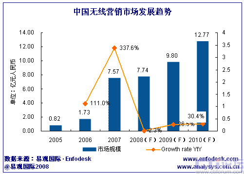 易觀國際(Analysys International)預(yù)計,2010年中國無線營銷整體市場規(guī)模將增至12.77億。其中增長最迅速的細(xì)分市場為WAP類廣告,預(yù)計2010年,WAP廣告在整體市場中所占份額將達(dá)56.7%,2007年至2010年WAP廣告市場收入平均復(fù)合增長率72.1%。WAP市場的增長動力將逐步由業(yè)內(nèi)廠商向傳統(tǒng)行業(yè)廠商擴(kuò)展。