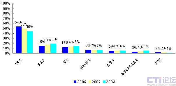 圖1 2006~2008年中國移動數(shù)據(jù)業(yè)務市場結(jié)構(單位:%)