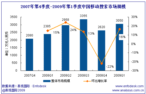 2009年第1季中國(guó)移動(dòng)搜索市場(chǎng)收入達(dá)3050萬(wàn),環(huán)比增長(zhǎng)16%