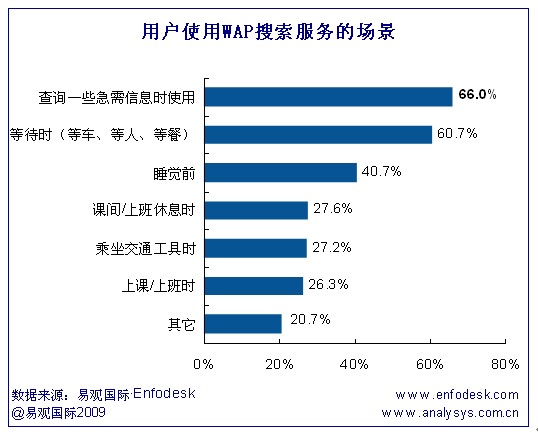 根據(jù)易觀Enfodesk《中國(guó)移動(dòng)搜索市場(chǎng)用戶調(diào)研報(bào)告2009》研究發(fā)現(xiàn),用戶使用WAP搜索服務(wù),一般情況是在查詢一些急需信息和等待時(shí)(等車、等人、等餐),這兩類情形的使用比例均在60%以上。值得注意的是,在睡覺(jué)前,用戶使用移動(dòng)搜索服務(wù)的比例達(dá)40.7%。而在其他休閑時(shí)間,如課間/上班休息時(shí)、乘坐交通工具、上課/上班時(shí)也是用戶經(jīng)常使用WAP搜索服務(wù)的場(chǎng)景。