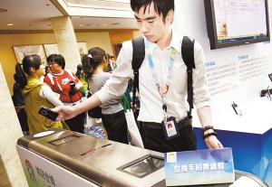 昨日,一位工作人員正在演示如何用手機(jī)檢票通過閘機(jī)。
