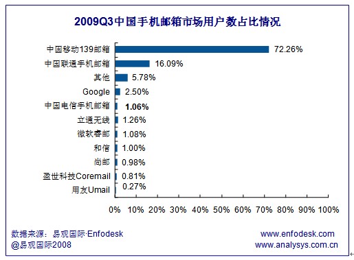 易觀:中移動(dòng)139郵箱領(lǐng)跑2009Q3手機(jī)郵箱市場(chǎng)