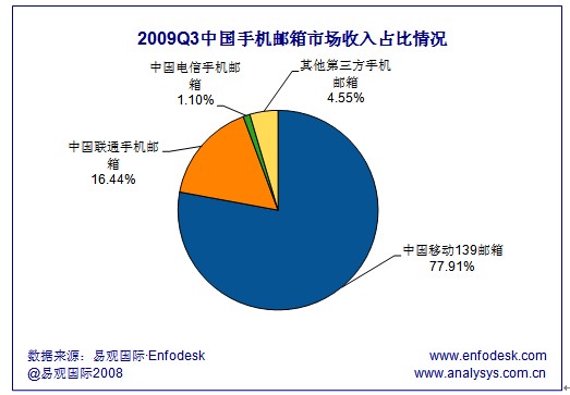易觀國際(Analysys International)研究發(fā)現(xiàn),中國電信運(yùn)營商手機(jī)郵件占中國手機(jī)郵箱市場(chǎng)總營收的95.45%,第三方手機(jī)郵箱廠商收入占比較少,僅為4.55%。而對(duì)于中國電信運(yùn)營商手機(jī)郵箱市場(chǎng)而言,中國移動(dòng)139郵箱占比較大,占2009Q3手機(jī)郵箱總營收的77.91%,領(lǐng)跑2009Q3中國手機(jī)郵箱市場(chǎng)。