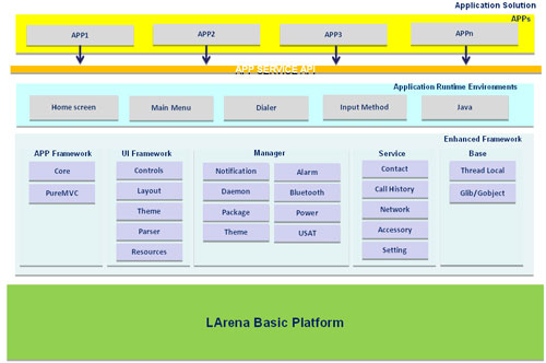 LARENA3.0是聯(lián)芯科技自主研發(fā)的高度可配置、可擴(kuò)展、開放性的業(yè)內(nèi)主流手機(jī)應(yīng)用平臺,它集通信、多媒體和移動互聯(lián)網(wǎng)功能于一體,實現(xiàn)了完整的應(yīng)用生命周期管理和動態(tài)加載能力,充分體現(xiàn)了TD-SCDMA特有創(chuàng)新技術(shù),并支持多種業(yè)務(wù)能力,提供豐富的工具套件。