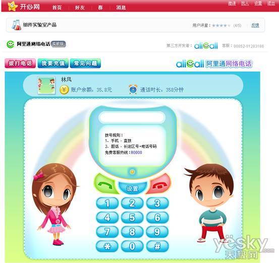 近日,阿里通網(wǎng)絡(luò)電話與國內(nèi)著名社交網(wǎng)站開心網(wǎng)合作,推出了定位于年輕族群,專為SNS網(wǎng)站量身定做的flash版網(wǎng)絡(luò)電話。開心網(wǎng)用戶只需在組件實(shí)驗(yàn)室中添加阿里通flash網(wǎng)絡(luò)電話,無須注冊和安裝任何插件,即可直接在開心網(wǎng)網(wǎng)頁上撥打全球任意的手機(jī)和固話。據(jù)悉,為了讓更多的用戶能體驗(yàn)到flash網(wǎng)絡(luò)電話的便利,只要開心網(wǎng)內(nèi)的好友達(dá)到5人,添加組件成功后都可獲贈(zèng)一定的免費(fèi)通話時(shí)長。