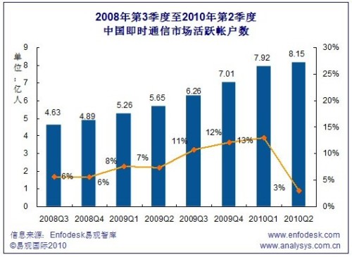 2010Q2中國(guó)即時(shí)通信市場(chǎng)活躍帳戶數(shù)超過8億