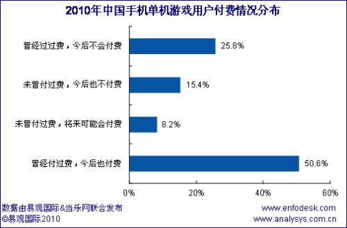 根據(jù)調(diào)研顯示,手機(jī)單機(jī)游戲中,有76.4%的用戶都有過付費(fèi)經(jīng)歷,但有25.8%的用戶表示今后將不在付費(fèi),出現(xiàn)這種現(xiàn)象原因有多種,主要還是存在損害用戶行為經(jīng)常發(fā)生,外加上眾多與PC交叉用戶的涌入,而這些用戶中免費(fèi)的、盜版的、破解的成為他們的首選,因此預(yù)計(jì)未來單機(jī)游戲的付費(fèi)比例還將下降。