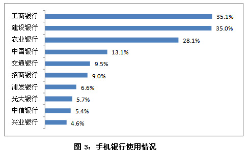 在對(duì)手機(jī)銀行用戶對(duì)手機(jī)銀行使用的情況分析來(lái)看,工商銀行(601398,股吧)手機(jī)銀行的使用率依然最高,達(dá)35.1%,建設(shè)銀行(601939,股吧)緊隨其后,為35.0%。通過(guò)進(jìn)一步的分析發(fā)現(xiàn),在經(jīng)常使用手機(jī)銀行的用戶中,對(duì)建設(shè)銀行手機(jī)銀行的使用率(37.4%)略高于對(duì)工商銀行的使用率(36.0%),這表明建設(shè)銀行的用戶相對(duì)養(yǎng)成了使用手機(jī)銀行的習(xí)慣。另外,農(nóng)業(yè)銀行(601288,股吧與中國(guó)銀行的使用率在這半年中都有顯著提升,不斷縮小與行業(yè)領(lǐng)跑者的差距。