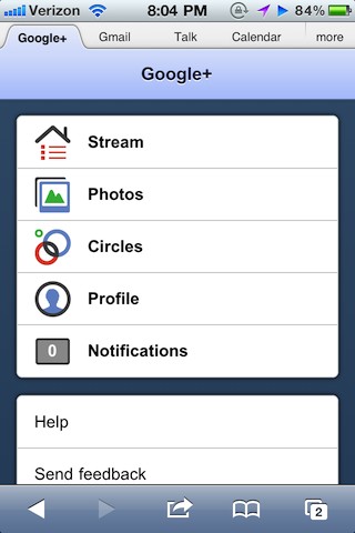 Google+移動(dòng)Web應(yīng)用幾乎實(shí)現(xiàn)了與Safari瀏覽器的完美兼容。只要用iOS Safari瀏覽器向plus.google.com網(wǎng)站發(fā)一封郵件,用戶就會(huì)收到一個(gè)用HTML5編寫(xiě)的Web應(yīng)用。雖然用戶用它無(wú)法像Huddle(群聊工具)等原生應(yīng)用(native app)那樣做到無(wú)所不能,但Google+的主要功能都在里面。Stream、Photos、Circles、Profile和Notifications均出現(xiàn)在主菜單。