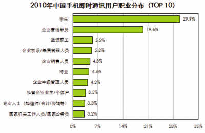 一系列研究數(shù)據(jù)足以說(shuō)明些問題。研究公司艾瑞咨詢報(bào)告數(shù)據(jù)顯示,2010年中國(guó)手機(jī)上網(wǎng)用戶達(dá)到3.03億,在總網(wǎng)民數(shù)中占比約為66.3%。這其中,57.4%的用戶使用即時(shí)通訊服務(wù),位列手機(jī)上網(wǎng)用戶十大行為的第二位。