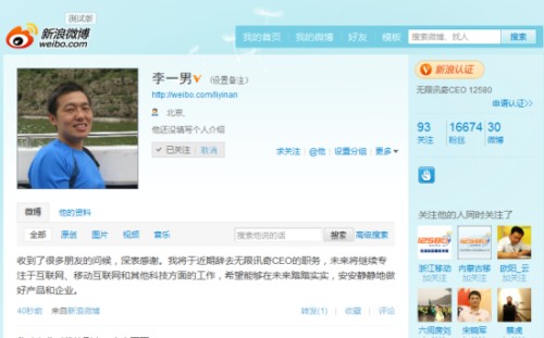 李一男(微博)宣布將辭去無限訊奇CEO職務(wù)