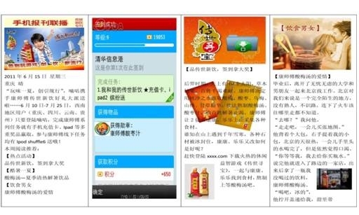 作為快消業(yè)的巨頭,康師傅一直不遺余力地探索新型營(yíng)銷方式,旨在拋棄以往單向、刻板的傳播思路,帶給消費(fèi)者全新的品牌體驗(yàn),“傳世新飲”作為康師傅創(chuàng)新營(yíng)銷方式代表者,定位于中華傳統(tǒng)飲品,希望把中國(guó)傳統(tǒng)飲料發(fā)揚(yáng)光大,所以其理想的消費(fèi)群體是20—29歲地年輕人群,而手機(jī)是這部分人接收信息、互動(dòng)娛樂(lè)的重要渠道,開展移動(dòng)營(yíng)銷也是據(jù)此作出的選擇。在與國(guó)內(nèi)領(lǐng)先的全方案移動(dòng)營(yíng)銷服務(wù)提供商百分通聯(lián)的合作中,康師傅一改單純的促銷形式,選擇了近來(lái)深受學(xué)生歡迎的手機(jī)位置化簽到和APP互動(dòng)小游戲進(jìn)行整合,并打通了微博、論壇、彩信手機(jī)報(bào)刊廣告、彩信等進(jìn)行立體化傳播,從而發(fā)揮出驚人的傳播能力。