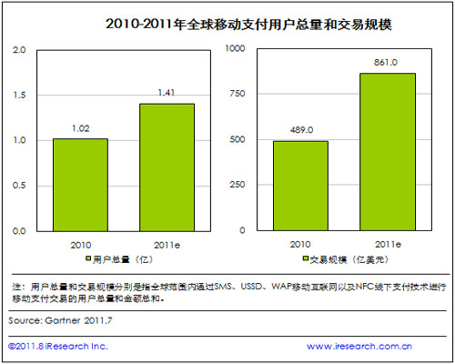 整理Gartner的最新數據研究發(fā)現(xiàn),預計2011年全球移動支付用戶規(guī)模將達到1.41億,較2010年增長38.2%;交易金額也將由2010年的489億美元增長至861億美元,增長率超過76%。該數據顯示,全球移動支付市場呈現(xiàn)穩(wěn)步增長態(tài)勢,而交易金額的增長速度遠遠超過用戶數量的增長速度也表明人們對于移動支付方式的依賴正在逐步加深。