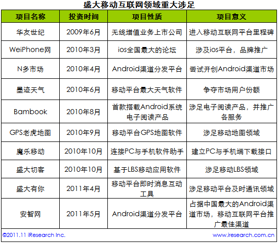 根據(jù)艾瑞咨詢整理的數(shù)據(jù)認(rèn)為,盛大一向秉持這“產(chǎn)業(yè)布局比產(chǎn)品開發(fā)更重要”的想法,縱觀盛大在幾年中對移動互聯(lián)網(wǎng)的產(chǎn)業(yè)鏈建立,投資及開發(fā)項(xiàng)目可謂是星光奪目。
