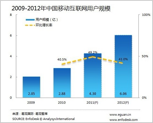 基于EnfoDesk易觀智庫對移動互聯(lián)網(wǎng)的持續(xù)研究,預(yù)計2012年市場用戶規(guī)模及從移動互聯(lián)網(wǎng)市場規(guī)模保持相對穩(wěn)定的增長,移動互聯(lián)網(wǎng)用戶數(shù)有機(jī)會在2012年突破6億,并且超過互聯(lián)網(wǎng)用戶數(shù)量,智能終端、移動互聯(lián)網(wǎng)應(yīng)用繼續(xù)延續(xù)2011年的增長速度。
