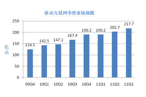 上圖是易觀國際發(fā)布的移動互聯(lián)網(wǎng)的相關數(shù)據(jù),數(shù)據(jù)截止到2011年第三季度,該圖顯示,2009年全球經(jīng)濟復蘇之后,移動互聯(lián)網(wǎng)業(yè)務收入一直保持著良好的增長狀態(tài),最新數(shù)據(jù)表明,2011年移動互聯(lián)網(wǎng)的整體市場規(guī)模已達到851億,遠超過2010年的637億,增長率將近33.6%,在移動互聯(lián)網(wǎng)業(yè)務子領域中,表現(xiàn)最突出的是移動電子商務,與2009年相比較,移動電子商務所占比例由3%直線增長到11%。但是在手機閱讀和手機游戲方面則表現(xiàn)平平,有較大的增長空間。預計2012年3G用戶規(guī)模將增長到6億,將會超過互聯(lián)網(wǎng)用戶數(shù)量,智能機以及移動互聯(lián)網(wǎng)還會保持或者超過2011年的增長速率。