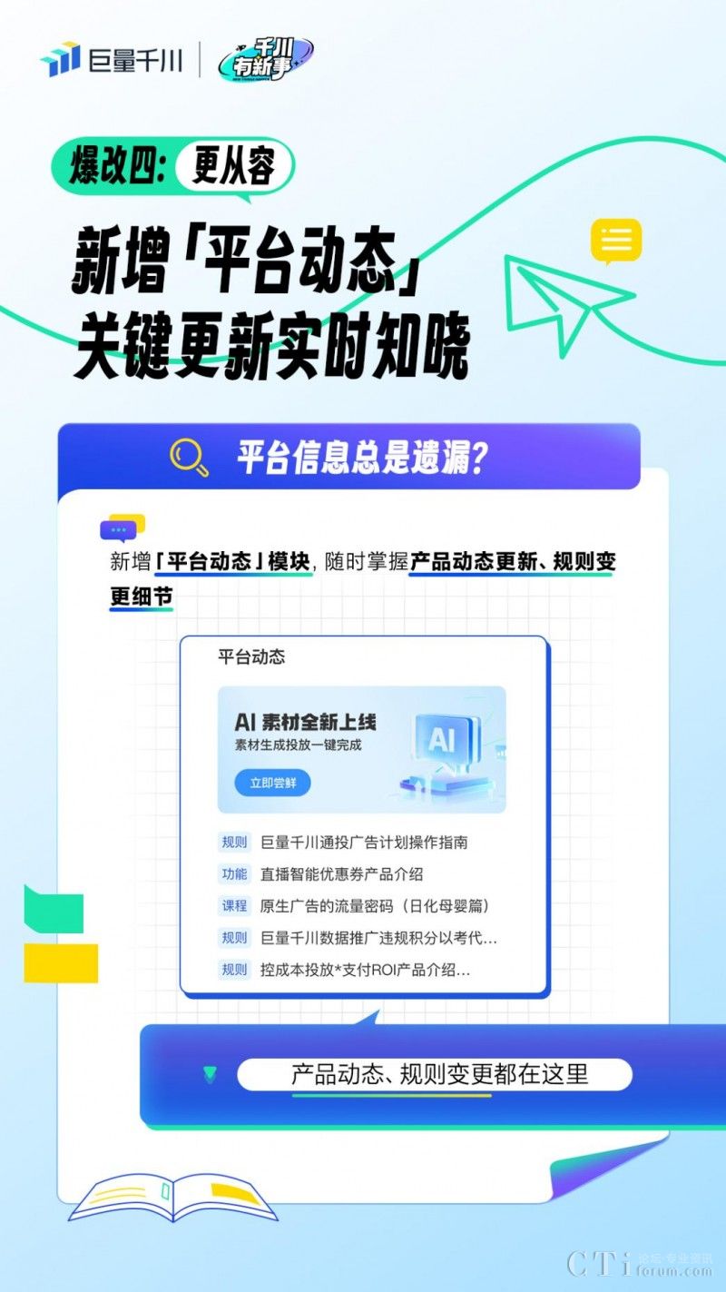 近期,為直面商家投放困境,全面提升投放效率,巨量千川PC端首頁(yè)全新推出四大重磅升級(jí)——上線「專(zhuān)屬診斷建議」、「數(shù)據(jù)看板」、「重磅產(chǎn)品推薦」和「平臺(tái)動(dòng)態(tài)」,助力商家更便捷、更從容地提升投放質(zhì)量和效果,高效推動(dòng)生意增長(zhǎng)!