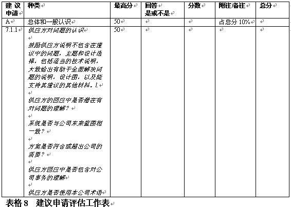 。。在決定了初步要求之后,評(píng)估小組應(yīng)具體地開展評(píng)估工作。具體評(píng)估的目標(biāo)是通過給建議書主要方面打分作出評(píng)估。可以在算出建議書各方面占總分?jǐn)?shù)的百分比,如表8中對(duì)各方面的總覽。一般在建議書內(nèi)向提供者給出這一信息。