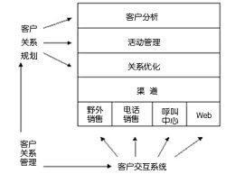 真正的CRM解決方案是一個(gè)復(fù)雜的聯(lián)合體,它由許多組件(即分析工具、活動(dòng)管理與事件引發(fā)等)與許多需要用來達(dá)到一對(duì)一的營銷能力(如間接管理、基于規(guī)章制度的工作流管理以及真正的渠道管理等)的新組件共同組成。此外,在非客戶聯(lián)系系統(tǒng)(如企業(yè)資源規(guī)劃與操作)與客戶聯(lián)系系統(tǒng)之間必須有接口。最后,在企業(yè)內(nèi)建立一套完整的便于知識(shí)管理的反饋循環(huán)系統(tǒng)也很必要。