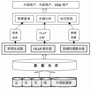 數(shù)據(jù)倉庫系統(tǒng)一般包括三層結(jié)構(gòu):數(shù)據(jù)獲取層、數(shù)據(jù)存儲(chǔ)層、數(shù)據(jù)輸出層。數(shù)據(jù)獲取層通常采用弱耦合方式與業(yè)務(wù)系統(tǒng)數(shù)據(jù)庫相連,通過對業(yè)務(wù)系統(tǒng)數(shù)據(jù)進(jìn)行抽取、轉(zhuǎn)換和加載后,導(dǎo)入數(shù)據(jù)倉庫;數(shù)據(jù)存儲(chǔ)層完成對數(shù)據(jù)倉庫系統(tǒng)中數(shù)據(jù)的存儲(chǔ)和管理,為了便于對海量數(shù)據(jù)的管理,總是把數(shù)據(jù)以一定的規(guī)則組織起來,如何從邏輯和物理上去組織數(shù)據(jù),是數(shù)據(jù)倉庫建設(shè)的重要步驟;數(shù)據(jù)的輸出層與OLAP服務(wù)器、數(shù)據(jù)挖掘服務(wù)器相連,對數(shù)據(jù)倉庫中的數(shù)據(jù)進(jìn)行多維分析和挖掘。