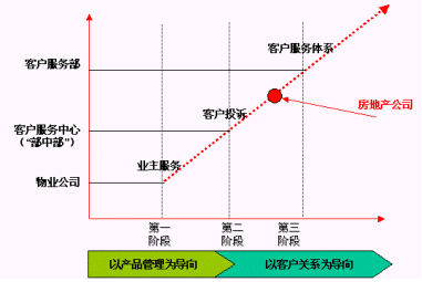 客戶(hù)服務(wù)的發(fā)展進(jìn)程,具體如下圖所示,目前國(guó)內(nèi)絕大多數(shù)房地產(chǎn)公司處于第二階段。
