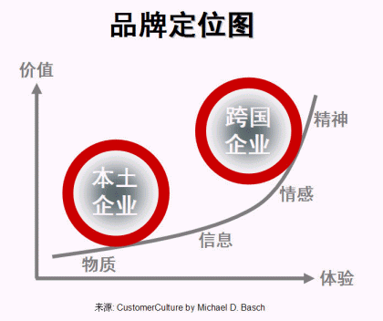 客戶體驗是客戶關(guān)系管理的重要組成部分。根據(jù)過去數(shù)年評選中國最佳CRM實施企業(yè)所作的分析,本土與外資企業(yè)在企業(yè)體檢中各項主要評分中有較大差距,其中之一是客戶體驗(-7.1分,見圖一、本土與跨國企業(yè)之差距)。本土企業(yè)若只提供低層次的客戶體驗,只為客戶帶來低價值,也只能打價格戰(zhàn)、做代工,很難做大做強(qiáng)打通全球市場。做好品牌,其實再深入一點說就是要做好客戶體驗,價值(價格)才會上去(見圖二、品牌定位)。