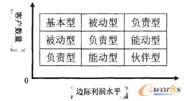 這5種類型之間并不具有簡單的優(yōu)劣對(duì)比或順序,因?yàn)槠髽I(yè)所采用的客戶關(guān)系類型取決它的產(chǎn)品以及客戶的特征,不同企業(yè)甚至同一企業(yè)在對(duì)待不同客戶時(shí),都有可能采用不同的客戶類型。一家生產(chǎn)日用化妝品的企業(yè),與它的化妝品消費(fèi)者個(gè)人之間常會(huì)建立一種被動(dòng)型的客戶關(guān)系,企業(yè)設(shè)立的客戶服務(wù)機(jī)構(gòu)或聯(lián)絡(luò)中心將聽取客戶的意見,處理客戶投訴以及改進(jìn)產(chǎn)品;但這家企業(yè)同大型超市或零售企業(yè),同連鎖的美容產(chǎn)業(yè)機(jī)構(gòu)之間,?赡芙⒁环N伙伴型的客戶關(guān)系,實(shí)現(xiàn)產(chǎn)銷企業(yè)之間的互惠互利?铺乩仗岢觯髽I(yè)可以根據(jù)其客戶的數(shù)量以及產(chǎn)品的邊際利潤水平,根據(jù)圖3指示的思路,選擇合適的客戶關(guān)系類型。