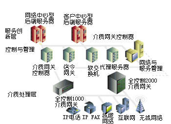 8200 IP傳真服務器等。中間層通過協(xié)議適配解決通用信令問題,并且提供網(wǎng)絡和服務管理。第一層包含Total Control 1000介質網(wǎng)關,它通過多種訪問網(wǎng)絡將不同類型的業(yè)務量綜合在一起。