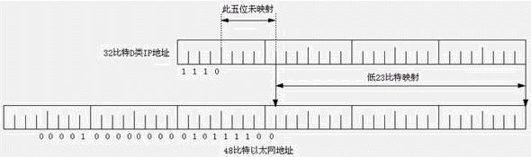 D類(lèi)地址的最后28比特沒(méi)有結(jié)構(gòu)化,即沒(méi)有網(wǎng)絡(luò)ID和主機(jī)ID之分。響應(yīng)某一個(gè)IP多播地址的主機(jī)構(gòu)成一個(gè)主機(jī)組,主機(jī)組可跨越多個(gè)網(wǎng)絡(luò)。主機(jī)組的成員數(shù)是動(dòng)態(tài)的,主機(jī)可以通過(guò)IGMP協(xié)議加入或離開(kāi)某個(gè)主機(jī)組。IP多播地址影射到以太網(wǎng)地址的方法見(jiàn)下圖。因?yàn)镮P多播地址的高5位未影射,因此,影射的以太網(wǎng)地址不是唯一的,共有32個(gè)IP多播地址影射到一個(gè)以太網(wǎng)地址。