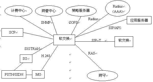 軟交換作為一個開放的實體,與外部的接口必需采用開放的協(xié)議。圖3舉例示出軟交換與外部的接口,實際的接口可能與此不同。