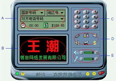 。ㄈ鐖D1)“王潮暢談?wù)Z音全球通”的主界面。A部分是虛擬液晶顯示屏,這里顯示的內(nèi)容與 D(功能鍵區(qū))相對應(yīng),B是廣告位,如果有興趣可以與王潮公司聯(lián)系作廣告(^_^),C是撥號(hào)區(qū),D是功能按鈕區(qū),集中了這個(gè)軟件的主要功能,E是音量調(diào)節(jié)區(qū)。整個(gè)界面簡潔合理。