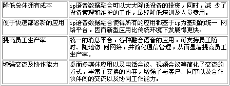 語音融合除了上面表格中所列的種種優(yōu)勢外,還能夠提供以前傳統(tǒng)通信平臺不具有的一些新的應(yīng)用。